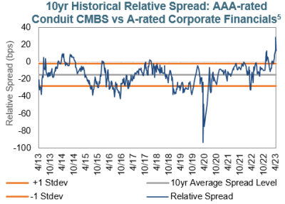 • We view current spread levels for senior AAA-rated conduit CMBS tranches as attractive relative to similar-duration corporate bonds, with the spread difference between the two sectors at the widest level in the last 10 years. Valuations appear even more attractive considering the credit enhancement embedded within senior tranches of conduit CMBS.
