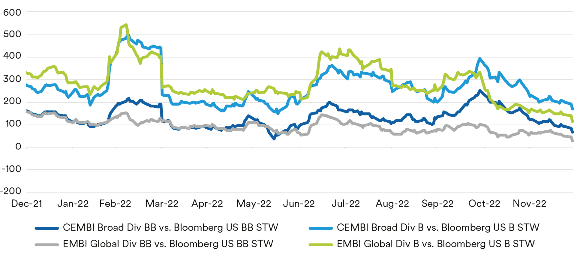 The macro headwinds afflicting Emerging Markets over the past 12 months have manifested in several areas including access to markets, commodity price volatility, the need for tight monetary policy and the difficulty of enacting fiscal adjustment. These conditions will likely ease as macro drivers improve, such as peaking global inflation, a continuous growth recovery in China, or a negotiated settlement/ceasefire to the Russia/Ukraine war. Recent data and news flow point in the right direction and has fueled a positive market response for EM assets since early November that could persist into 2023. Alternatively, we think some skepticism is prudent and would expect more volatility should there be a reversal in any of the recent trends. Certainly, EM assets would not take kindly to a prolonged period of spotty market access, volatile commodity prices, tighter monetary policy for longer, and further downgrades to EM sovereign ratings.