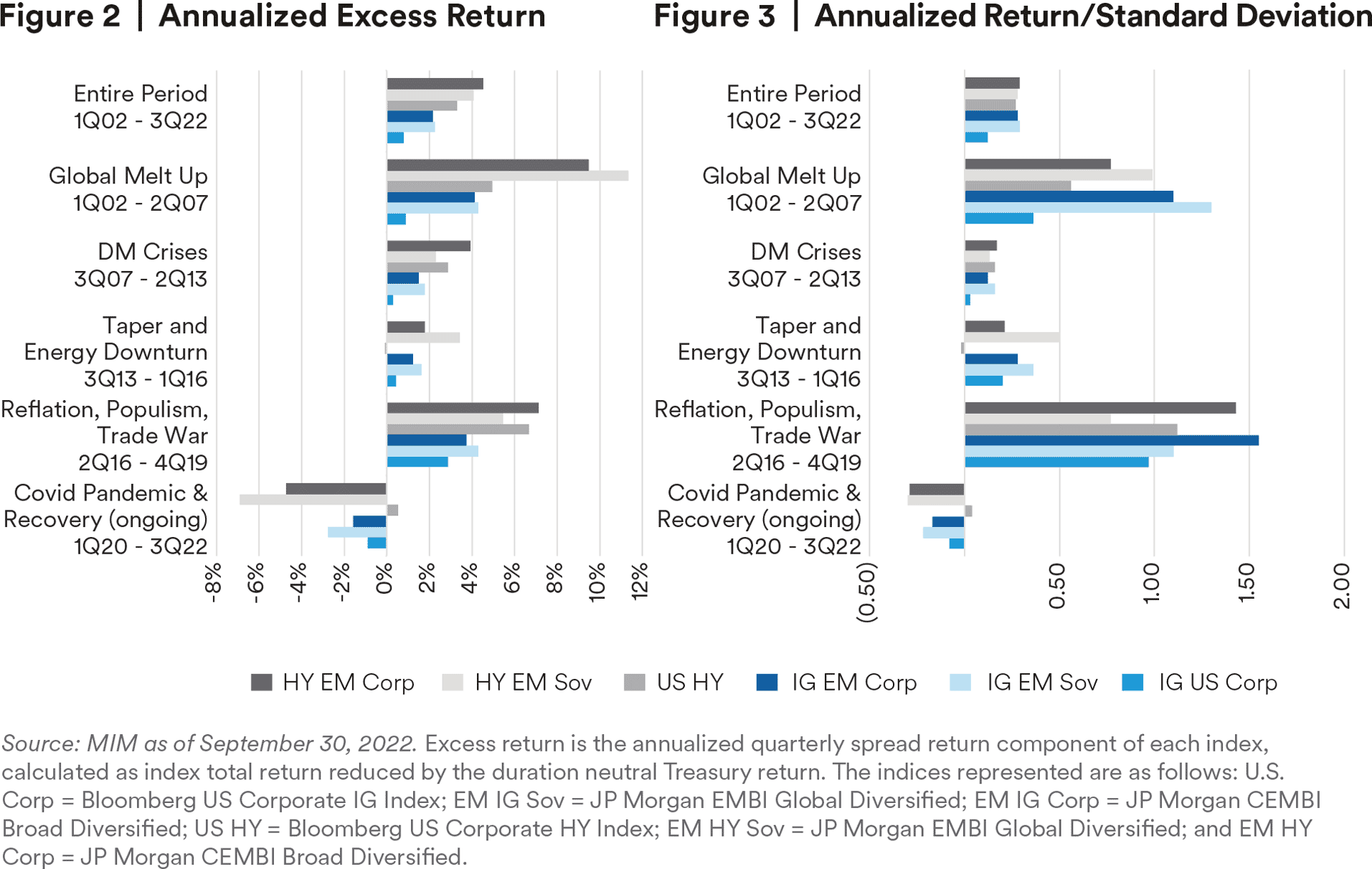 We believe that the macro landscape will remain the primary driver of EM fundamentals and asset returns during 2023. Recent inflation indicators and China’s economic reopening is encouraging, and EM asset prices have reacted positively. If these trends remain in place, we believe there is more room for EM assets to outperform, and should a ceasefire also occur in Ukraine, the upside for EM becomes even greater. That said, we are watching headlines with caution, and acknowledge downside risks, which would be negative for EM assets. We are inclined to maintain a more defensive positioning into the new year, focusing on securities that we feel are attractively priced but will prove resilient should the downcycle extend. We can identify several assets in hard currency sovereigns, corporates and local currency that meet these criteria. We do anticipate a turning point sometime in 2023 when EMD will begin to trade more on its own fundamentals, and with lower correlations that provide greater diversification benefits to global bond investors. As this scenario starts to unfold, we will act accordingly and adjust positioning to try and capture opportunities as the market presents them.