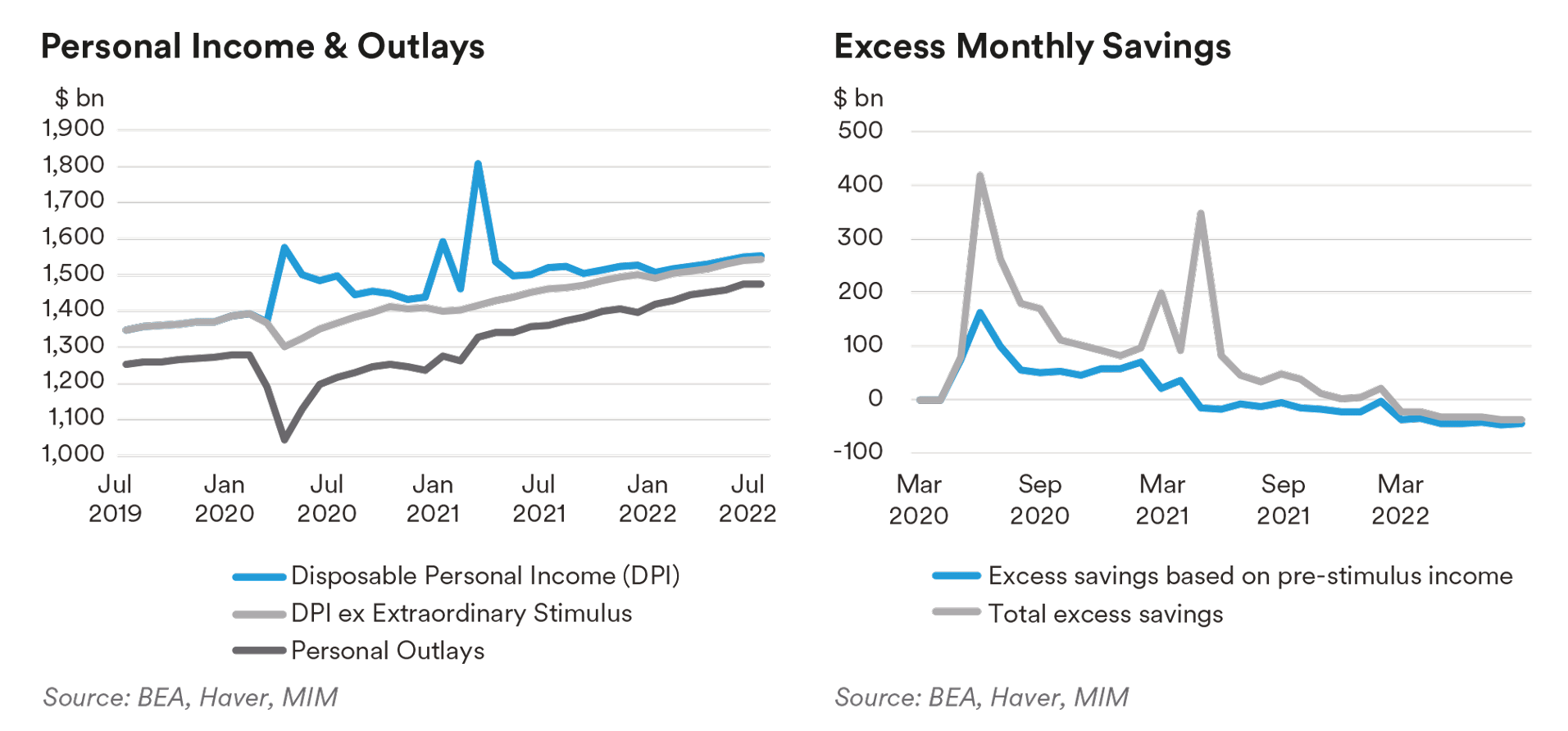 Consumers still have a lot of savings. A simple back-of-the-envelope calculation estimates the excess savings in the trillions. From March 2020 to June 2022, the Bureau of Economic Analysis reports that personal income has exceeded personal spending by a cumulative $5.5 trillion. At the prepandemic savings rate of 7.3%, consumers would have saved about $3.2 trillion, but, in fact, they have an additional hoard of around $2.3 trillion. It was not just stimulus savings that led to the hoarding of savings—pandemic inactivity contributed as well. In the same report, consumers saved some 8.2% of disposable personal income, even excluding extraordinary transfers—$357 billion above the pre-pandemic savings rate. Consumers finally began to reduce their excess savings in 2022, albeit slowly. In July, according to the BEA’s most recent month’s personal income and outlays report, they spent $36 billion above usual outlays. At that rate, it would take more than five years for consumers to spend down their accumulated pandemic savings. This doesn’t mean that we expect consumer strength for the next five years—the calculations are too simplistic. There are several factors working against this outcome, including inflation and the possibility of higher long-run savings rates. A slightly more detailed approach of forecasting personal income and spending could shed better light on expected consumer behavior.