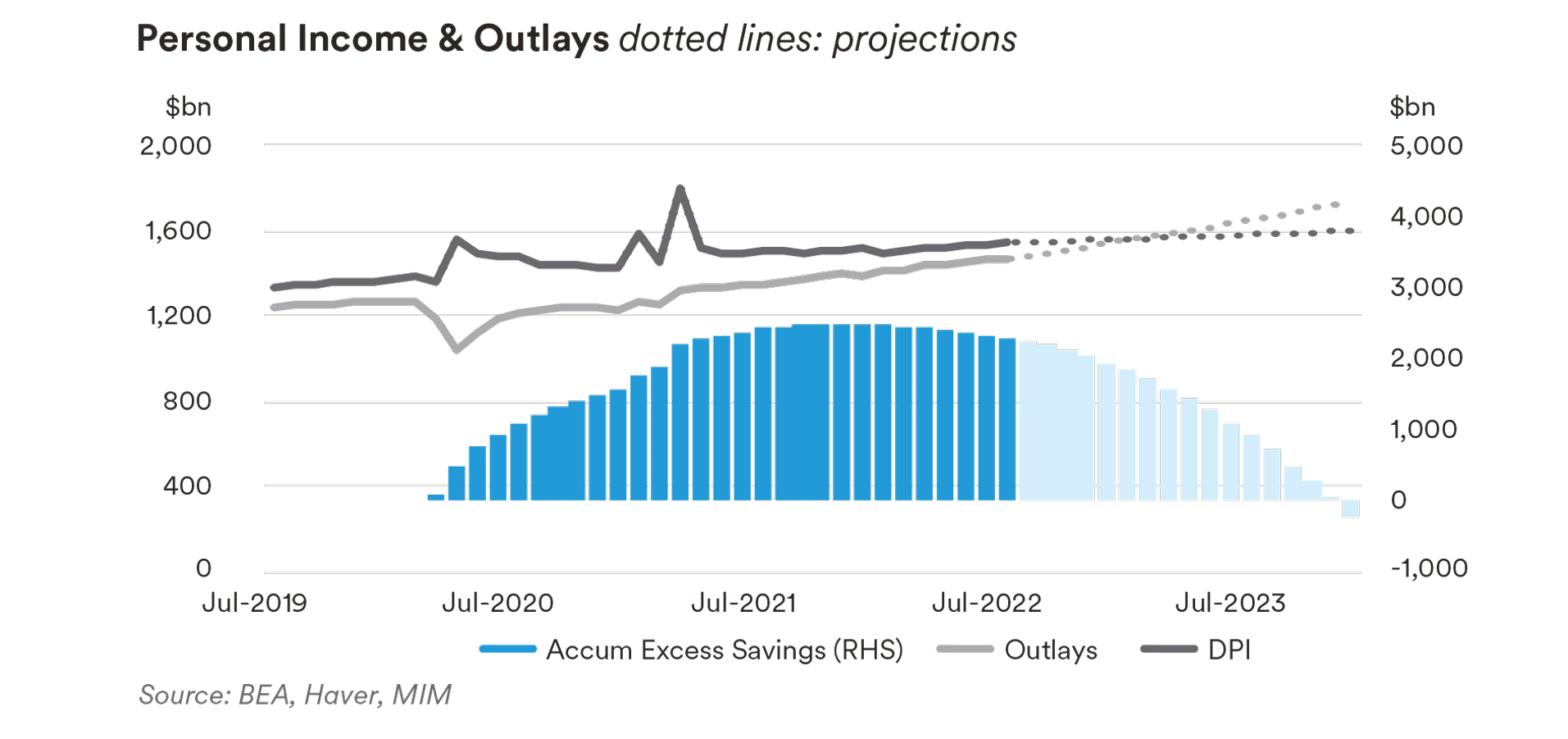 Excess savings of U.S. consumers is so far defying the Fed’s efforts to constrain consumer growth via rate hikes. With their massive stash of savings, we expect them to continue to defy the Fed for some time to come. Equally, there are a number of forces that are likely to impede continued spending past the end of 2023. As a result, we continue to expect a recession in 2023 rather than earlier—or later.  Endnotes 1 Bureau of Economic Analysis 2 Financial Accounts of the United States, Federal Reserve Board 3 It is very possible, however, that the lowest income group, those that are more severely liquidity constrained, may already have run out of savings. Aside from anecdotal evidence of economic hardship caused by inflation, there is evidence in the more rapid growth of credit card debt. 4 “U.S. consumer: A macro and micro perspective,” Erika Najarian, UBS Global Research, Aug 1, 2022. Read more from MetLife Disclaimer This material is intended solely for Institutional Investors, Qualified Investors and Professional Investors. This analysis is not intended for distribution with Retail Investors. This document has been prepared by MetLife Investment Management (“MIM”) solely for informational purposes and does not constitute a recommendation regarding any investments or the provision of any investment advice, or constitute or form part of any advertisement of, offer for sale or subscription of, solicitation or invitation of any offer or recommendation to purchase or subscribe for any securities or investment advisory services. The views expressed herein are solely those of MIM and do not necessarily reflect, nor are they necessarily consistent with, the views held by, or the forecasts utilized by, the entities within the MetLife enterprise that provide insurance products, annuities and employee benefit programs. The information and opinions presented or contained in this document are provided as of the date it was written. It should be understood that subsequent developments may materially affect the information contained in this document, which none of MIM, its affiliates, advisors or representatives are under an obligation to update, revise or affirm. It is not MIM’s intention to provide, and you may not rely on this document as providing, a recommendation with respect to any particular investment strategy or investment. Affiliates of MIM may perform services for, solicit business from, hold long or short positions in, or otherwise be interested in the investments (including derivatives) of any company mentioned herein. This document may contain forward-looking statements, as well as predictions, projections and forecasts of the economy or economic trends of the markets, which are not necessarily indicative of the future. Any or all forward-looking statements, as well as those included in any other material discussed at the presentation, may turn out to be wrong. All investments involve risks including the potential for loss of principle and past performance does not guarantee similar future results. In the U.S. this document is communicated by MetLife Investment Management, LLC (MIM, LLC), a U.S. Securities Exchange Commission registered investment adviser. MIM, LLC is a subsidiary of MetLife, Inc. and part of MetLife Investment Management. Registration with the SEC does not imply a certain level of skill or that the SEC has endorsed the investment advisor. This document is being distributed by MetLife Investment Management Limited (“MIML”), authorised and regulated by the UK Financial Conduct Authority (FCA reference number 623761), registered address 1 Angel Lane, 8th Floor, London, EC4R 3AB, United Kingdom. This document is approved by MIML as a financial promotion for distribution in the UK. This document is only intended for, and may only be distributed to, investors in the UK and EEA who qualify as a “professional client” as defined under the Markets in Financial Instruments Directive (2014/65/EU), as implemented in the relevant EEA jurisdiction, and the retained EU law version of the same in the UK. MIMEL: For investors in the EEA, this document is being distributed by MetLife Investment Management Europe Limited (“MIMEL”), authorised and regulated by the Central Bank of Ireland (registered number: C451684), registered address 20 on Hatch, Lower Hatch Street, Dublin 2, Ireland. This document is approved by MIMEL as marketing communications for the purposes of the EU Directive 2014/65/EU on markets in financial instruments (“MiFID II”). Where MIMEL does not have an applicable cross-border licence, this document is only intended for, and may only be distributed on request to, investors in the EEA who qualify as a “professional client” as defined under MiFID II, as implemented in the relevant EEA jurisdiction. For investors in the Middle East: This document is directed at and intended for institutional investors (as such term is defined in the various jurisdictions) only. The recipient of this document acknowledges that (1) no regulator or governmental authority in the Gulf Cooperation Council (“GCC”) or the Middle East has reviewed or approved this document or the substance contained within it, (2) this document is not for general circulation in the GCC or the Middle East and is provided on a confidential basis to the addressee only, (3) MetLife Investment Management is not licensed or regulated by any regulatory or governmental authority in the Middle East or the GCC, and (4) this document does not constitute or form part of any investment advice or solicitation of investment products in the GCC or Middle East or in any jurisdiction in which the provision of investment advice or any solicitation would be unlawful under the securities laws of such jurisdiction (and this document is therefore not construed as such). For investors in Japan: This document is being distributed by MetLife Asset Management Corp. (Japan) (“MAM”), 1-3 Ki