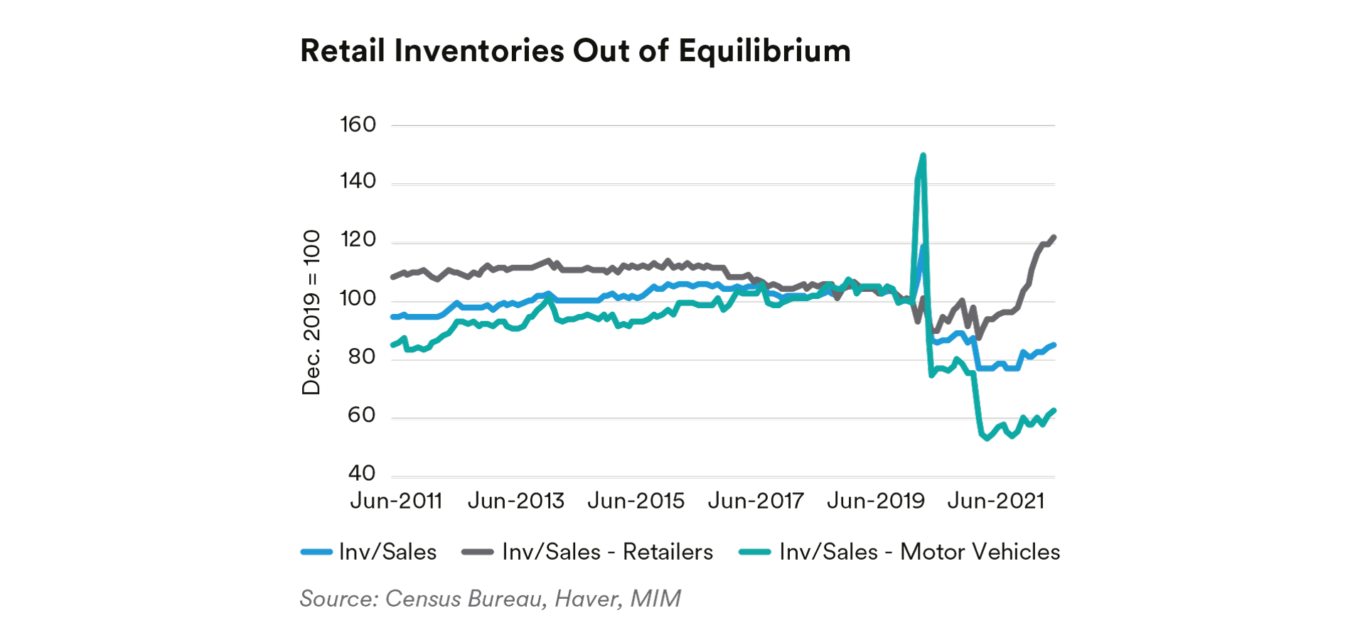 Producer Patterns. Perhaps the most discussed of the various shocks to the economy, supply chains have seen enormous volatility during the pandemic.Inventories show the stresses well. For general merchandise stores (so called “big box” stores that sell a broad variety of goods), inventories relative to sales have skyrocketed. The inventory-to-sales ratio for motor vehicles and parts remains historically low with minimal signs of recovery; the story is similar at the aggregate level, although not quite as extreme. Certainly, inventories have become a much more prominent problem for retailers, as all components of inventory management—projecting consumer demand as well as managing supply chains—remain uncertain. Most firms are likely still not at their long-run desired levels of inventories. Achieving more appropriate inventory levels is a multifaceted problem. Oneproblem—likely more difficult than in prior times—is determining the correct, new desired inventoryto-sales ratio. Another point is forecasting demand growth given ever-changing consumer preferencesand macroeconomic uncertainty. A third is getting suppliers to actually supply in a timely manner. Each of these points has a much higher level of uncertainty than in prior times, and this forecast uncertainty is likely to extend the period of dislocation.