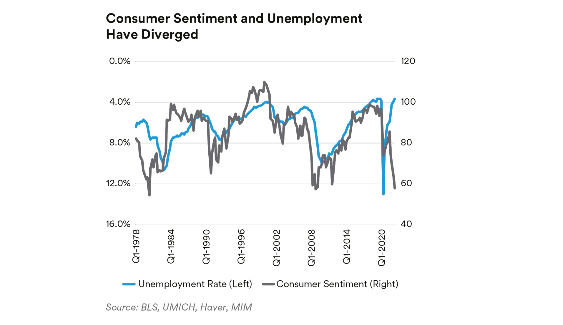 Labor Market and Consumer Asynchrony. There’s an unusual asynchrony building between the labor market and consumers. Normally, there is some correlation between unemployment and consumer sentiment. As unemployment falls (LHS, inverted axis), consumers feel better, and sentiment improves. Consumer sentiment tends to plateau a bit before unemployment, but at no other time since record-keeping began, has consumer sentiment diverged this dramatically from unemployment. Whether this foreshadows an uptick in unemployment, or something else altogether, is so far unclear.