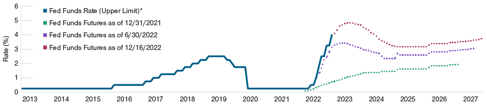 Market expectations for the federal funds rate were consistently too low in 2022 (Figure 1). In fact, how high the Federal Reserve will raise rates and how long they will hold them at elevated levels remains unknown. What is clear is that they are determined to avoid a replay of the 1970s and will do whatever it takes to get inflation back to healthy levels, even if their actions push the U.S. economy into recession. In 2023, the Fed’s primary focus will be on lowering wage inflation, and we should not expect a shift in policy unless the labor market also weakens considerably.
