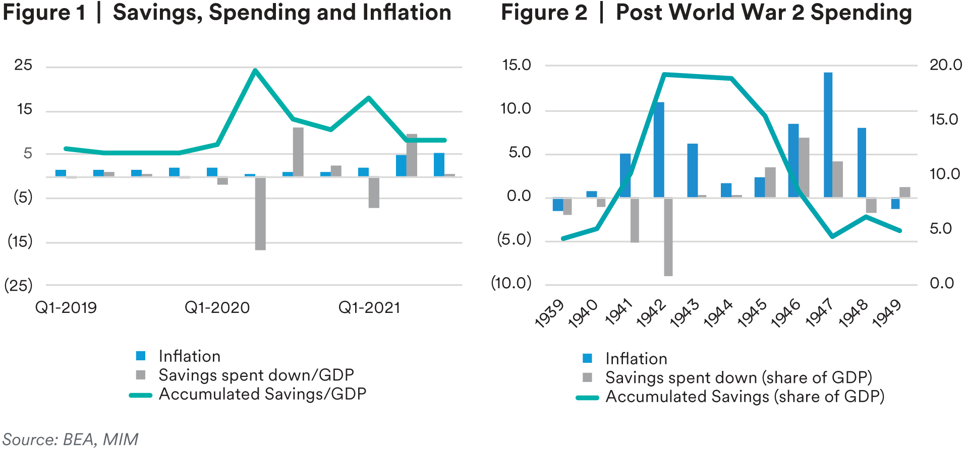 With all the attention on the much-discussed inflation risks, there is a risk that inflation falls much more sharply than expected later this year. Consumer demand and supplier production are uncertain and unlikely to line up well with each other. Some sectors are likely to suffer from weaker demand and more persistent supply-side problems than others (e.g. travel and automobiles, respectively), while a benign resolution to the pandemic could well see a sharp fall in demand for goods as patterns of consumption revert more to services. While sectoral trends will vary, more broadly there is the potential for the lagged supply side response to overshoot a largely transitory period of high consumer demand (as household savings return to a more normal level). Should this occur, it could easily lead to the emergence of oversupply and disinflationary pressures over the medium-term. On the demand side, if consumer spending collapses and consumer confidence has fallen in recent months, this may result in unexpected price weakness, particularly if firms overbuy or overexpand capacity. While many observers remain worried about a return to the 1970s via stagflation, another concern would be replicating the 1940s. After WW2, with the lifting of rationing and the return of soldiers from the war, people spent down their accumulated savings. This led to a few years of high inflation, followed by a lengthy decline in price pressures. There is some likelihood of the current spending spree ending in a disinflationary (although not necessarily deflationary) slump.
