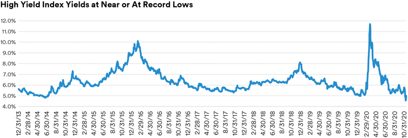 Fundamental credit analysis. Given the inherent higher risk nature of HY, fundamental credit analysis is critical to help protect against downside risk.  In fact, in the current uncertain environment with risks related to COVID, the shape of the economic recovery, oil price volatility and election impacts, deep fundamental credit analysis and security selection is now more important than ever.  Certain industries are facing significant stress, some business models remain challenged and many issuers’ credit metrics are deteriorating as they have taken on large amounts of debt to shore up capital/liquidity positions.  As such, credit analysts must identify those names that are at risk for downgrades and default and determine whether there is adequate compensation for heightened credit risk.  Credit analysts can also help identify the issuers that could thrive in the current environment, including potential future upgrade candidates to investment grade (i.e. rising stars).
