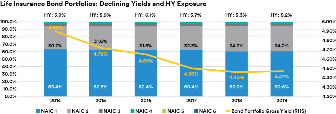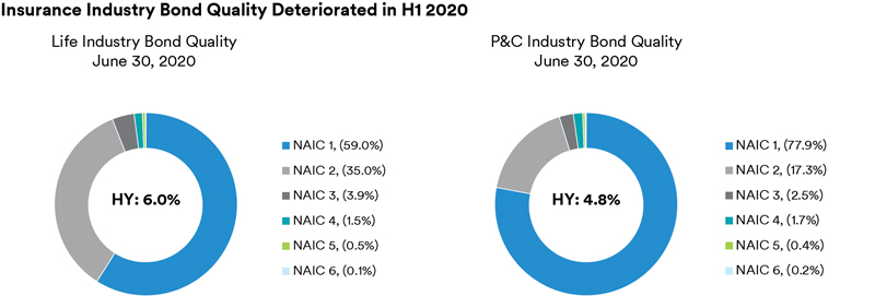 With bonds comprising the largest component of life and property & casualty insurance investment portfolios and yields declining over the last few years as a result of lower interest rates, the quality composition of insurers’ bond portfolios has shifted.  For the life insurance industry, as shown in the figure below, within bond portfolios, NAIC 2 allocations (or the equivalent ratings range of BBB+ to BBB- on an S&P scale) increased by 3.5 percentage points over the five-year period from year-end 2014 to 2019, to 34.2% of total bond portfolios at December 31, 2019.  This increase reflects the significant growth in the size of the BBB U.S. corporate credit market, by an estimated 61% during the same period to $3.65 trillion (for the ICE BofA BBB corporate index), as well as the search for higher yielding investment grade (IG) securities.  In contrast, allocations to higher quality (NAIC 1, representing A-rated and above) and lower quality (NAIC 3-6, representing BB-rated and below) bonds declined.  At December 31, 2019, high yield represented 5.2% of total bond portfolios, down from 5.9% at year-end 2014.  Further, high yield exposure is down from the peak allocation of 6.1% at year-end 2016.  While the need for income did not dissipate over this period, life insurers, including some large publicly traded companies, de-risked portfolios in recent years as a result of commodity-price weakness, late-cycle credit concerns and rich valuations that did not reflect rising recession risks.  By rating category, life insurers’ high yield portfolios skew toward higher quality, with nearly 2/3 invested in NAIC 3 rated bonds (representing BB+ to BB- ratings).