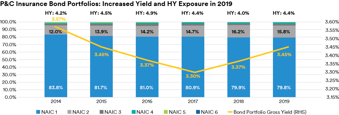 Bond quality for the P&C industry varies from the life industry, most notably with higher exposure to NAIC 1 and lower exposure to NAIC 2 holdings.  Additionally, with generally shorter-tail liabilities and lower investment capital charges as compared to life insurers, the variation in high yield allocations has not been as dramatic for P&C insurers; in fact, the industry’s exposure to high yield increased in 2019 to 4.4% of total bonds at December 31, 2019 from 4.0% at December 31, 2018.  The mix of P&C insurers’ exposure to high yield is relatively balanced between NAIC 3 and NAIC 4 holdings, as shown in the figure below.