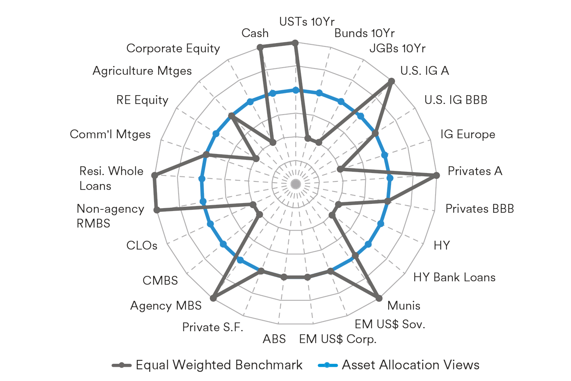 Note: 1. The asset class views in the chart above are based solely on our macroeconomic views, sector fundamentals, and market expectations by the authors, which may be different from MetLife's, Portfolio Managers' and sector strategists' views, which are included in this report. For illustrative purposes only. 2. The asset class views are not associated with any MetLife or Client portfolios. 3. No portfolio specific constraints are considered in these asset allocation views. 4. The asset class views reflect a relative directional overweight/underweight among the assets, without absolute weightings.