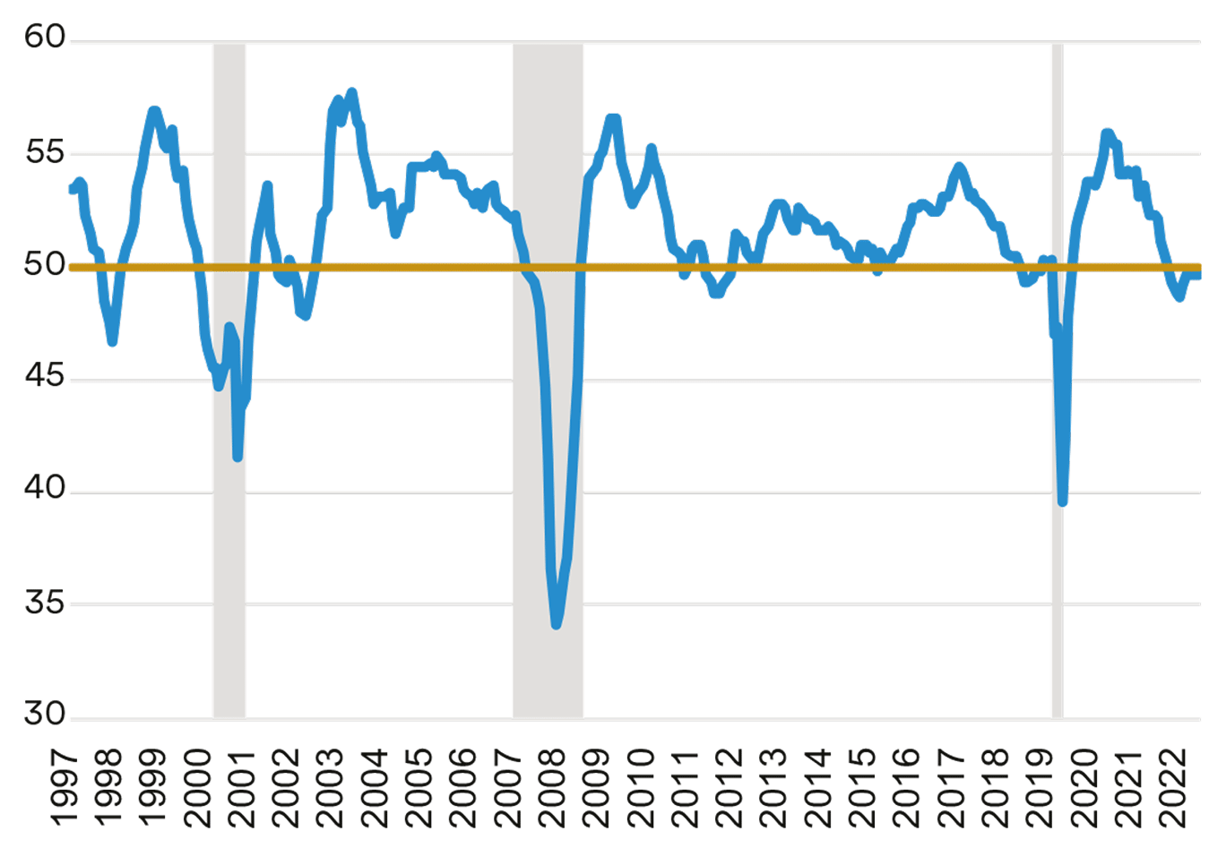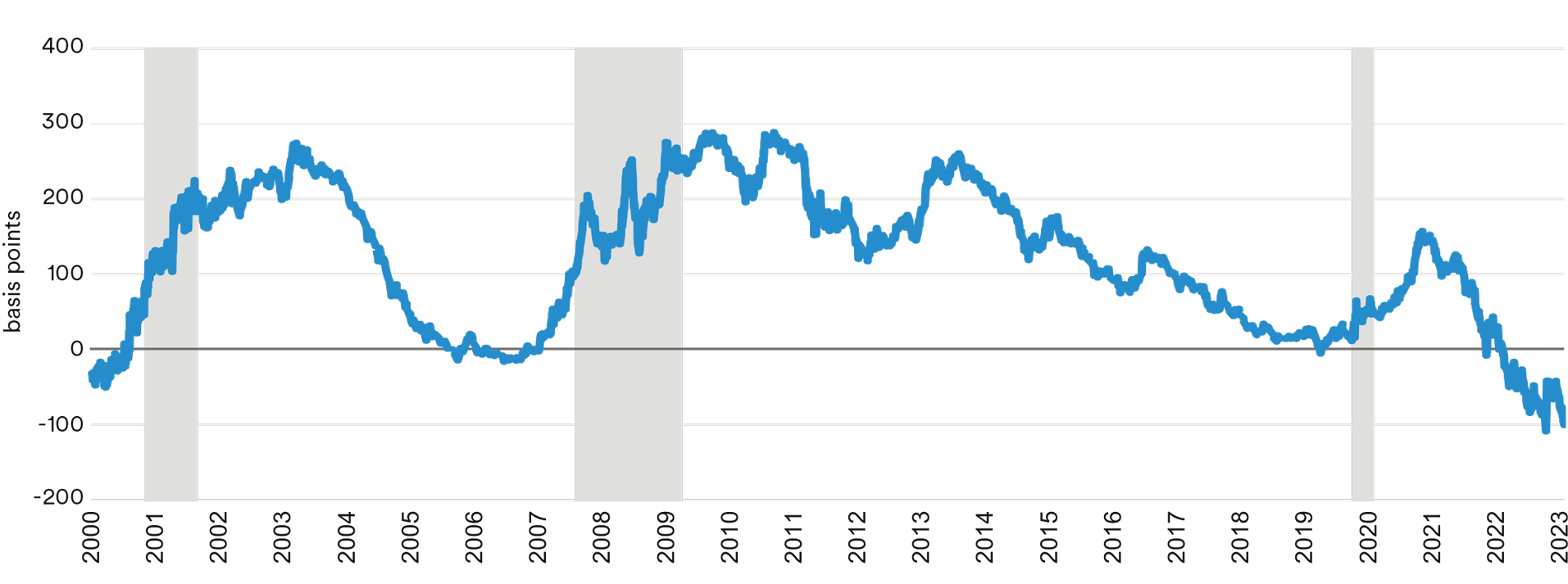 Note: Shaded areas denote recessions. Source: Federal Reserve Bank of New York, J.P. Morgan, MetLife Investment Management (MIM)