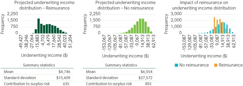Source: S&P Capital IQ - P&C Industry, P&C Income Statement as of 9/30/2022 The dominance of investment income on P&C insurers’ income statements presents a great opportunity for insurers to leverage the modelling capabilities of Insight Investment’s insurance solutions team to better understand downside risk to surplus as it pertains to underwriting risk, reserve risk, liquidity risk and investment risk. Insight’s team assists clients with dynamic financial analysis, which includes stress testing, strategic asset allocation, and forecasting downside risk to statutory surplus or net position. Figure 3 is a visual representation of the impact of reinsurance coverage on income distribution.