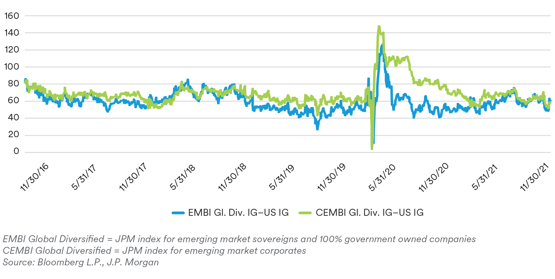 Despite a strong recovery thus far in the asset class, we believe there are still attractive opportunities across EM at these valuations as some credits have been over penalized in this downturn and have lagged in the ascent. The key is to differentiate those sovereigns and corporates that have sufficient buffers to withstand near-term liquidity pressures on a gradual road to recovery. Recently, the spread differential between EM and DM widened as EM underperformed DM in the second half of 2021. Concerns about a China slowdown driven by the property sector weighed on EM as a whole. The widening differential leaves room for potential spread compression over the coming quarters, as we continue to see supportive policy measures even in the face of Federal Reserve tapering. Over the coming months, as we anticipate more clarity on both U.S. taper policy and China’s policy response, there should be an opportunity to capitalize on the spread differentials between EM and DM. Security selection and country rotation will be key for any EM investor, as not all opportunities are created equally, and the dispersion in returns could be significant.