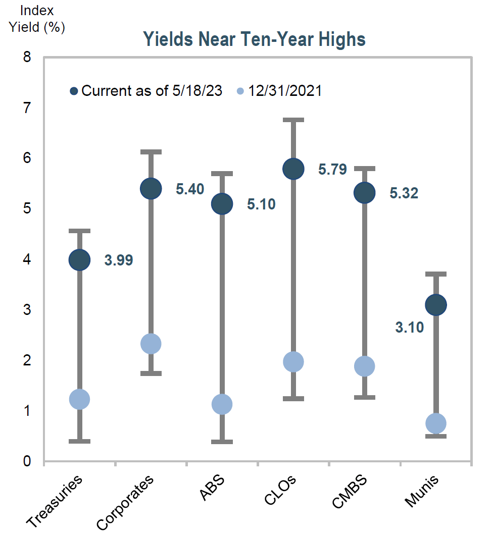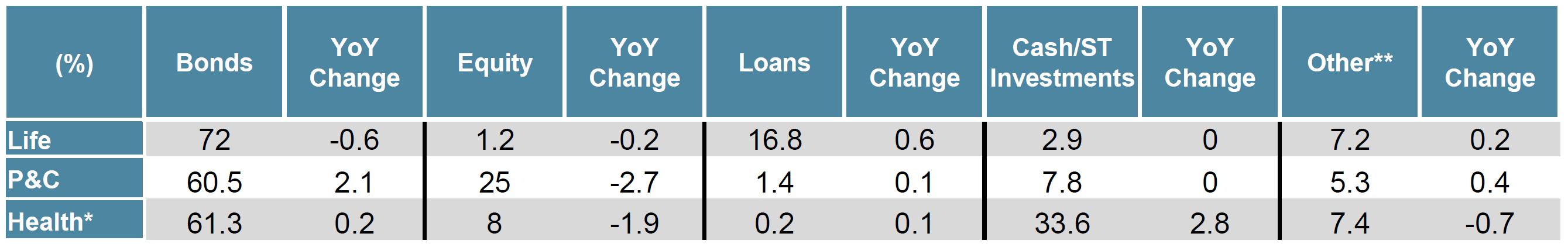 Sources: S&P SNL Financial as of 12/31/22, but retrieved on 5/18/23 and Bloomberg as of 5/18/23. Historical Book Yields Relative to Market Yields Chart: Sourced from S&P SNL Financial and Bloomberg. P&C and Health market yields are the Bloomberg Intermediate Aggregate Index, Life market yield is 50% Bloomberg Corporate Index/50% Bloomberg Long Corporate Index.
