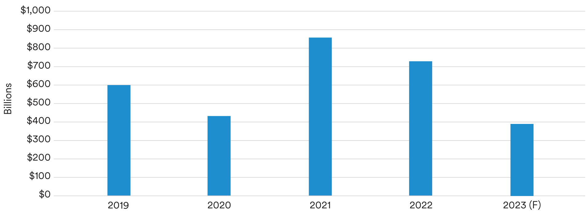 Real estate capital markets conditions have been volatile over the past several quarters. As expected, the rise in interest rates has impacted real estate transaction activity, and property values have begun to decline. In the first quarter of 2023, 56% fewer trades occurred than was the case a year earlier, as wide bid-ask spreads result in muted transaction volume. Looking forward, we expect around $390 billion in transaction activity this year, compared to $601 billion in 2019 and $738 billion in 2022 (see exhibit 1).