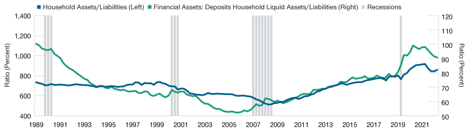(Fig. 1) Total and liquid assets as a share of U.S. households’ liabilities are high relative to history