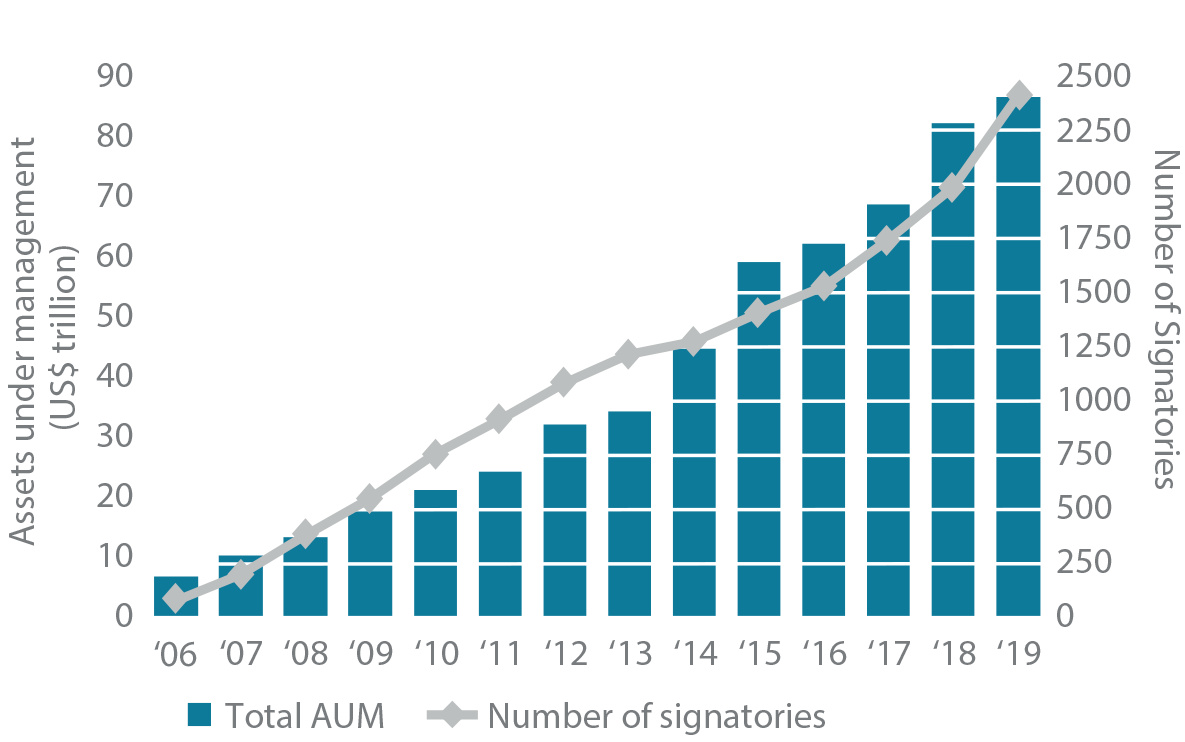 The UNPRI consists of six principles designed to align investors with “broader societal goals.” These principles form the conceptual scaffold around which signatories might build their internal ESG processes. The adoption of these principles has been noteworthy: from 100 at the outset to more than 2,300 today, including some of the largest asset managers in the world (Figure 1). While today’s headlines reflect plenty of disagreement about what the “broader societal goals” should be, the growth in adherents to the UNPRI mirrors a broader consensus that market failures are not as uncommon as some investors might like to believe.