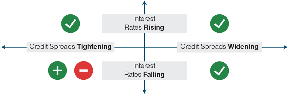In addition to the strategy’s goal of delivering alpha across the broad credit market, we also strive to limit undue credit beta and duration risk. We believe that our approach to portfolio construction makes the strategy a compelling and consistent credit allocation, and its differentiated returns also enable it to complement other credit allocations. The strategy’s lower credit beta profile should allow it to hold up well in environments where credit spreads5 are widening, while its lower duration profile should be a positive in rising interest rate environments.