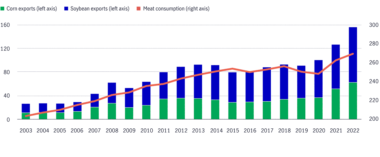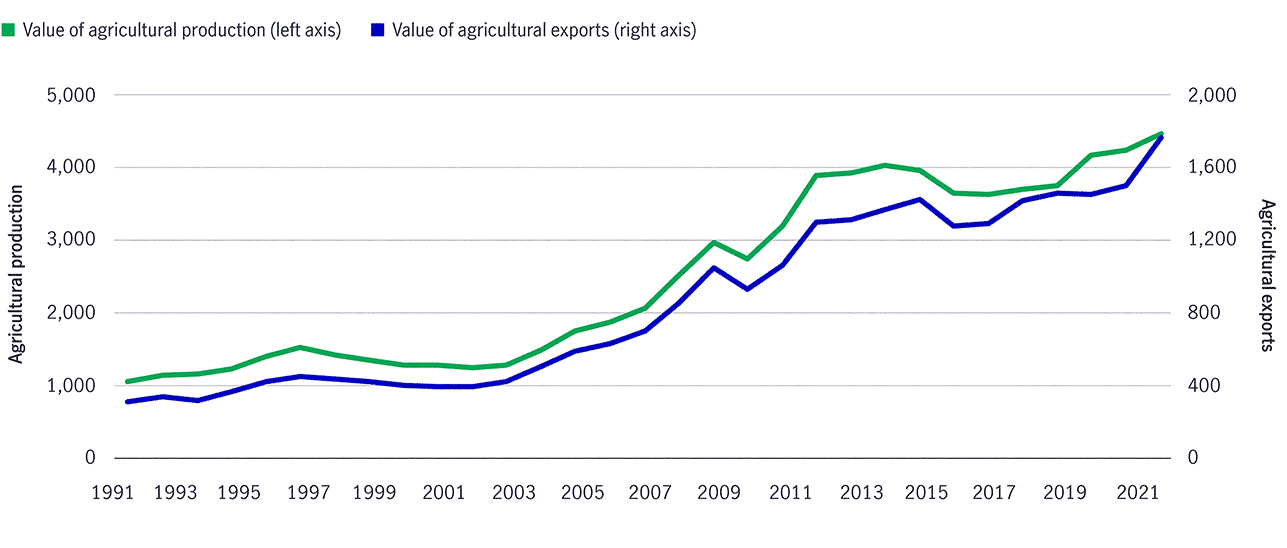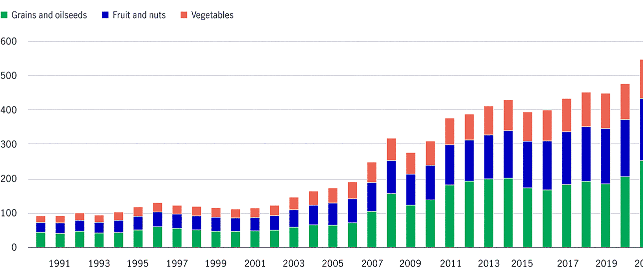 Source: ITC Trade Map, as of August 31, 2023. While there are challenges associated with trading in agriculture, there are also opportunities. The loss for the U.S. soybean sector was a gain for Brazil, which has replaced the United States as China’s leading soybean supplier, even after a truce was reached between the United States and China in 2020. And when China imposed tariffs on U.S. farm products, U.S. almonds were also affected, with increasing consumption of almonds in China relying on imports to meet its vast domestic demand. Australia, the largest almond production region in the southern hemisphere, increased its almond exports to China in 2018 and 2019, resulting in its negligible pre-2018 exports to China rising to an average of $250 million from 2019 to 2022. In this case, the challenges experienced by one region’s exports once again resulted in lasting opportunities for another market.